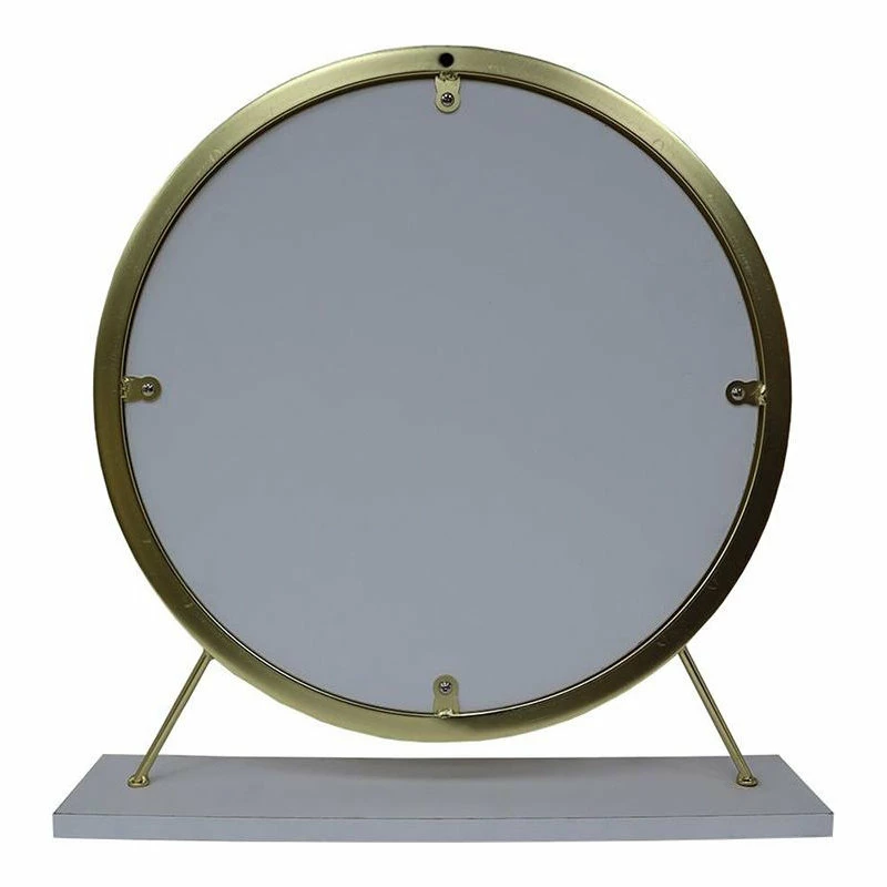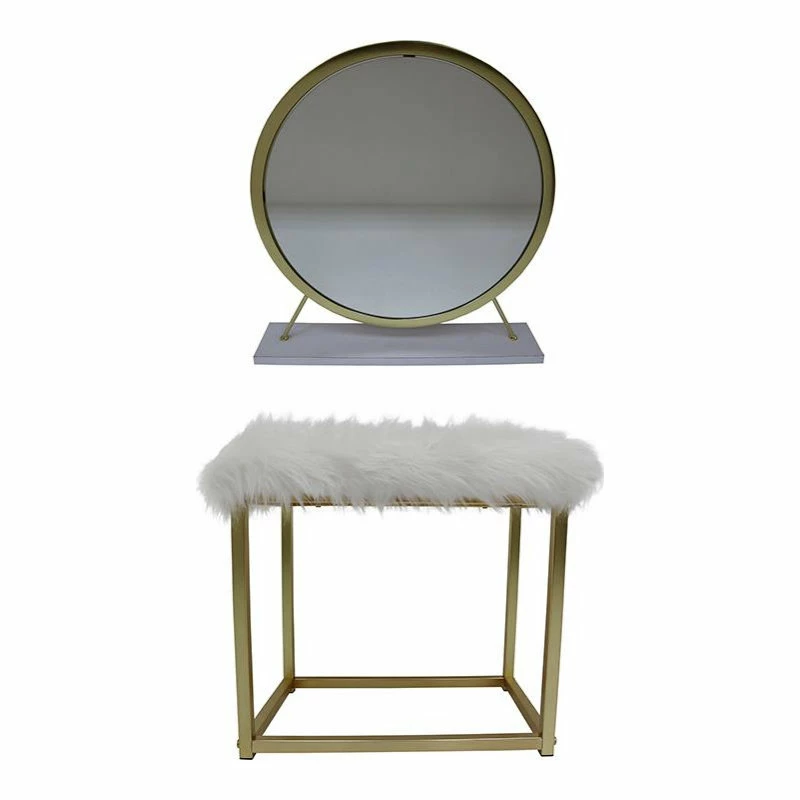 Turn any desk into a vanity with the charm of this contemporary vanity mirror and stool set. Featuring a beautiful brass finish frame and legs, the round mirror sits on a rectangular base that offers excellent stability. The stool is a backless design with a plush faux fur cushion and a sturdy base with a brass finish that matches the mirror perfectly. This impeccable set is both modern and feminine, perfect for completing your favorite vanity table or counter.