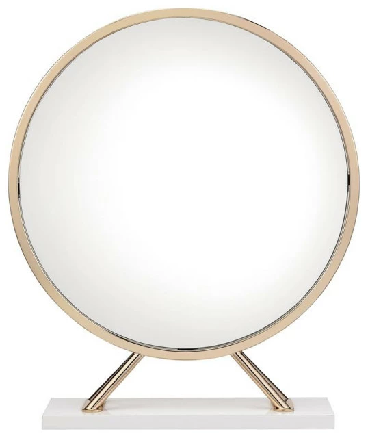 The modern design employs a sense of simplicity in every sophisticated detail. A clean-lined metal frame lends a sleek finishing touch, while a lustrous gold finish adds dazzling shine to its striking silhouette. The attached stool features a padded seat cushion that is comfy and soft to touch. A round mirror highlighted with a gold outline exudes posh, modern opulence. The Midriaks collection offers beautiful home additions that are easy fit and stylish.