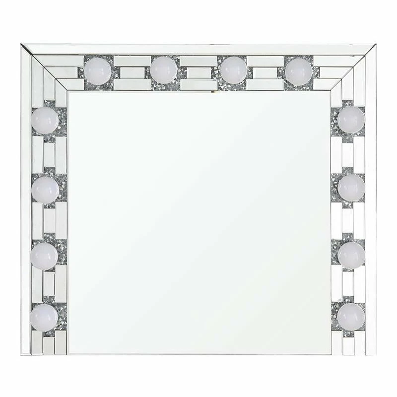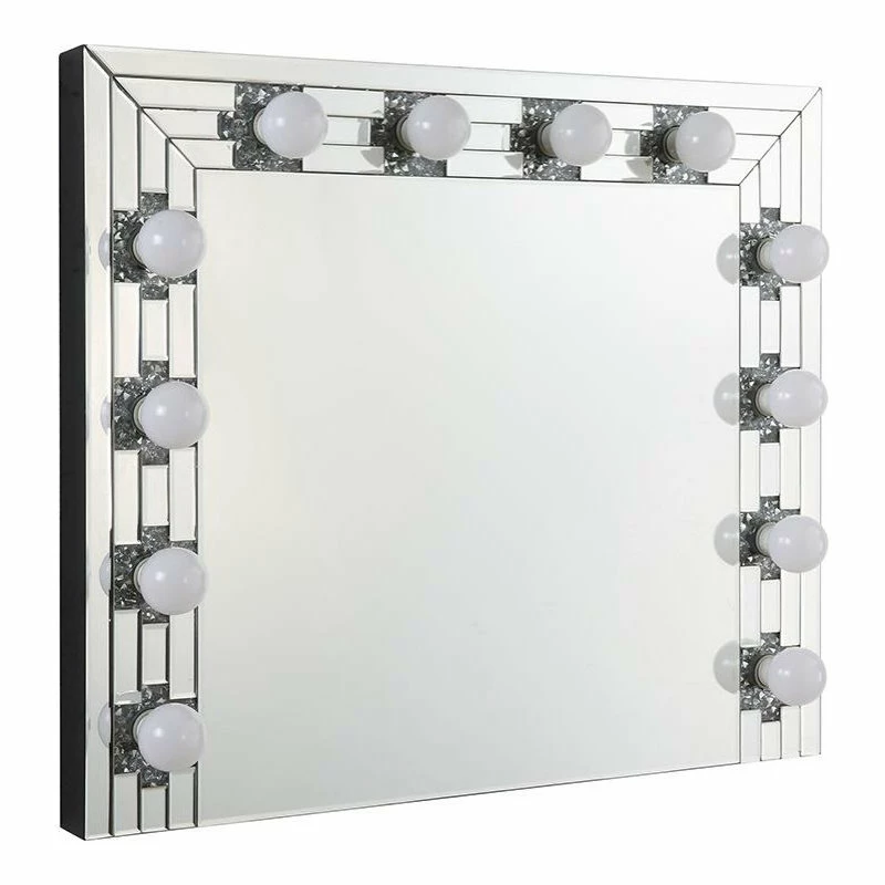 Bring glam ambiance to your bedroom, vanity, or living space with this lighted wall mirror. Its square center mirror is surrounded on three sides with mirror tile trim interrupted with wells for four lights on each of those three sides. At the base of each light is diamond-like accenting that glitters when the mirror is illuminated. Whether over a console or upgrading your bathroom, this wall mirror is a true statement-maker.