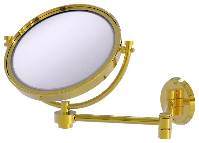 Add this stylish makeup mirror to your bathroom decor for an elegant touch. Makeup and shaving mirror pivots and tilts to allow for complete versatility in viewing angles while extending up to 14 Inches. Mirror is made from the finest solid brass materials. 8 inch double faced mirror features clear magnification on one side.