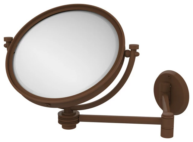 Add this stylish makeup mirror to your bathroom decor for an elegant touch. Makeup and shaving mirror pivots and tilts to allow for complete versatility in viewing angles while extending up to 14 Inches. Mirror is made from the finest solid brass materials. 8 inch double faced mirror features clear magnification on one side.