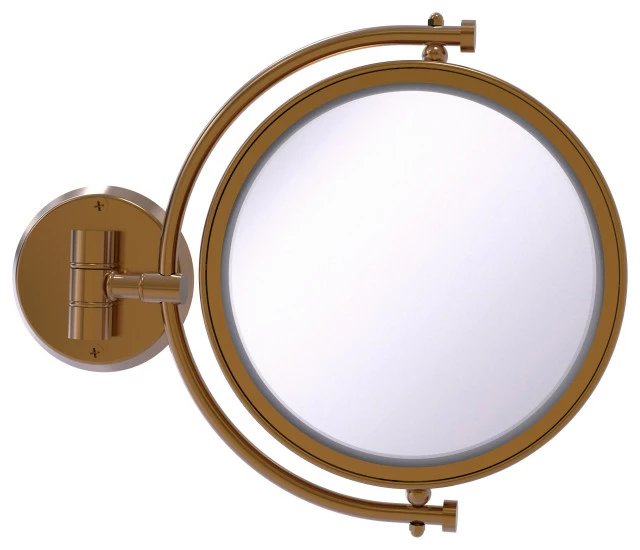Add this stylish wall mounted makeup mirror to your bathroom decor for an elegant touch. Makeup and shaving mirror pivots and tilts to allow for complete versatility in viewing angles. Mirror is made from the finest solid brass materials. 8 inch double faced mirror features clear magnification on one side.