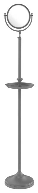 Elegantly and efficiently designed, this floor standing 2 sided magnification mirror with convenient tray is an easy solution for your daily make-up or grooming routine. The dual-sided mirror features a clear magnification for those close-up applications on one side and a 1x magnification on the opposite side for a quick all around check at any angle and a tray for easy access items. With classic accents, this free- standing vanity mirror is the crowning touch to your bathroom accessories.
