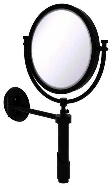 Add this stylish wall mounted makeup mirror to your bathroom decor for an elegant touch. Makeup and shaving mirror pivots and tilts to allow for complete versatility in viewing angles. Mirror is made from the finest solid brass materials. 8 inch double faced mirror features clear magnification on one side.