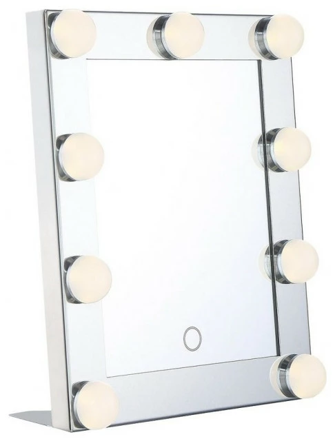 Rectangular Dimmable LED Tabletop Mirror with Touch Sensor Switch and Round Bulb on Frame 10 inches W x 11.75 inches H 10 Inch 45W 9 LED Table Mini- Mirror . Portable Molly LED Mirror with Portable Vintage Molly Tabletop USB Cable/Battery Operated4 x AAA Batterie (not included) Touch Sensor Switch. Product Type: Mini MirrorFixture Shape: RectangularCable/Wire Length: 120 inchesLocation Type: DAMP LocationBulbs Included: YesLumens: 500Bulb Kelvin: 3000/4200/6400Dimmable: YESMore information: 45W/LED 3000/4200/6400K/500lm (dimmable)More Information: Touch sensor switchMore Information: USB Cable/Battery OperatedMore Information: Rated for damp locationsMore Information: 4x AA Batteries (Not Included)