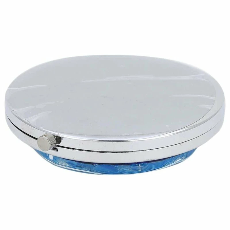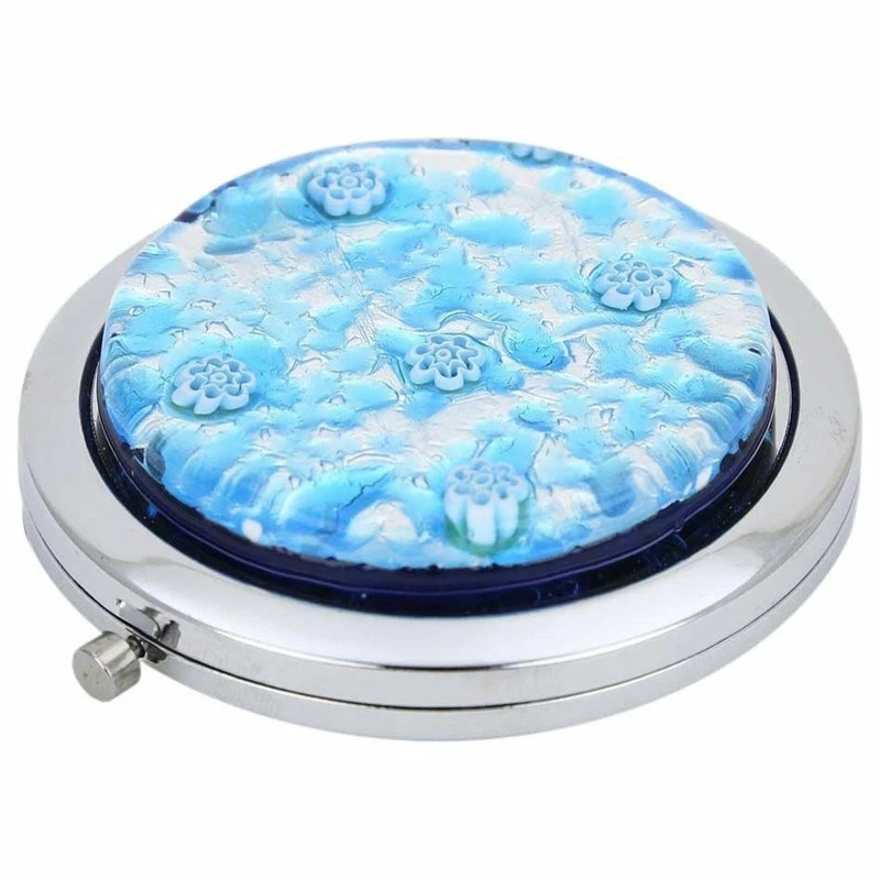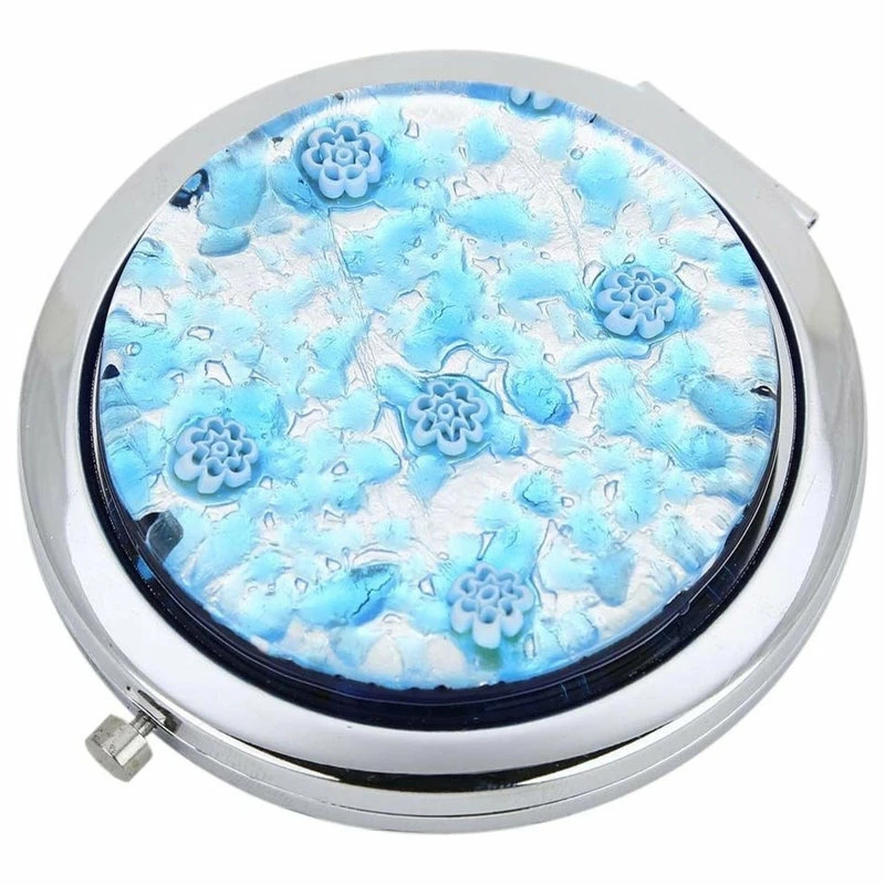The folding mirror features authentic Murano Glass top and shiny durable silver-plated finish. It opens up to reveal two high-quality round mirrors. The mirror is easy to open with a click of a button and it closes easily and securely. There is no glass on the bottom.