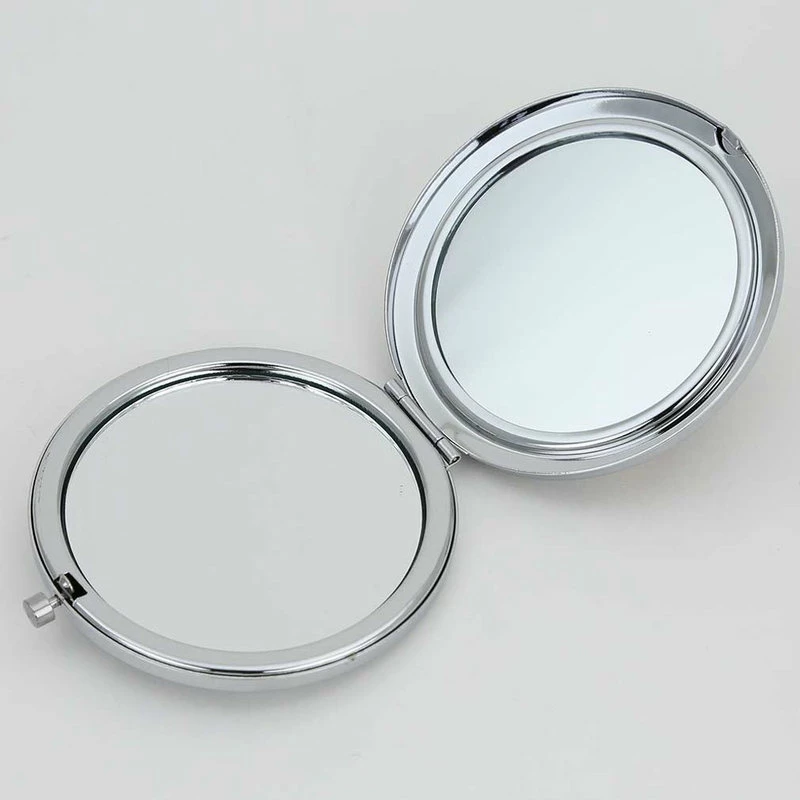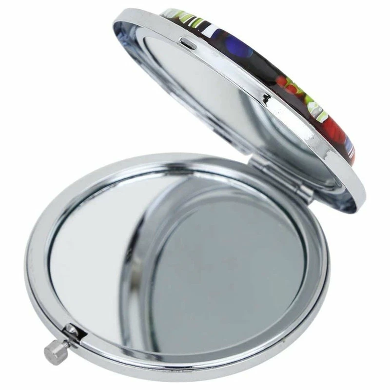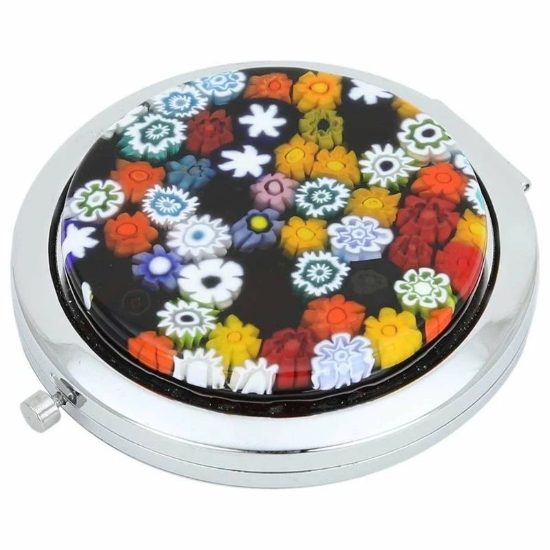 The folding mirror features Millefiori top and shiny durable silver-plated finish. It opens up to reveal two high-quality round mirrors. The mirror is easy to open with a click of a button and it closes easily and securely. There is no millefiori design on the bottom.