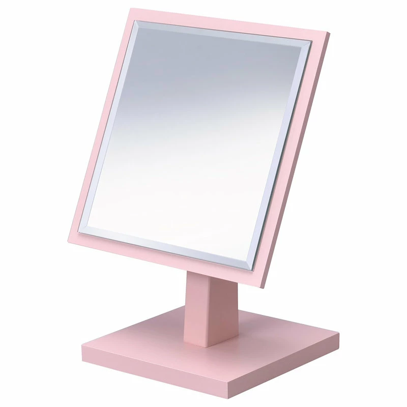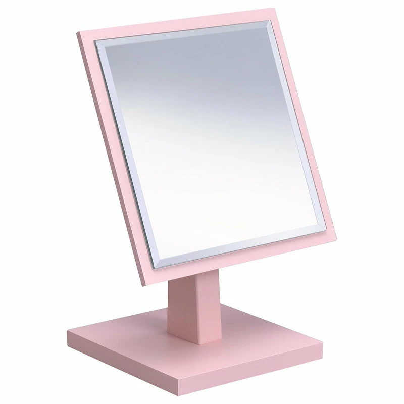 The Pretty Pink Square Make Up Vanity Mirror is a fashionable desktop mirror for easy and quick styling. The frame and stand are made of all-natural wood and veneers in a pretty, pale pink color and feature a beveled square mirror. This chic modern mirror rotates 360-degrees making it ideal for trying on accessories, applying makeup, taking selfies, putting in contacts, or any other situations where a close up mirror is needed. Crisp and casually cool, this mirror will be a great addition to your bedroom, bathroom or desk. 9.5″H x 7″ W x 5.5″ D