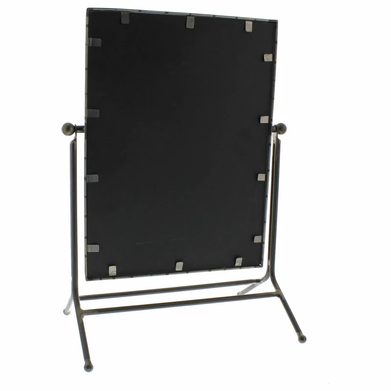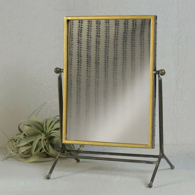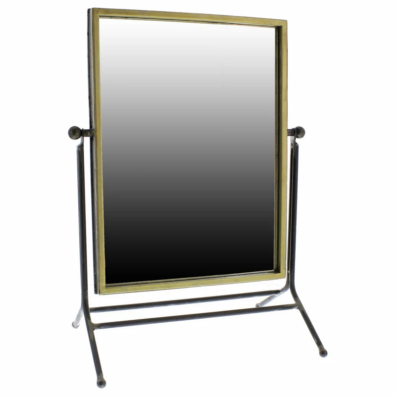 This Rustic Goldtone Rectangular Vanity Mirrorr is the perfect compliment to any bedroom or bathroom. This gold tone trimmed rectangluar mirror sits on a base of dark burnished metal that gives a classic item a modern update. Generous in size and stature, the mirror swivels and angles to get the perfect relection. Handcrafted, the distressed and rustic finish makes this mirror truly beautiful and one of a kind. Ideal for bedroom, bathroom, countertop or vanity. 17.5″ x 12.75″ x 8.5″