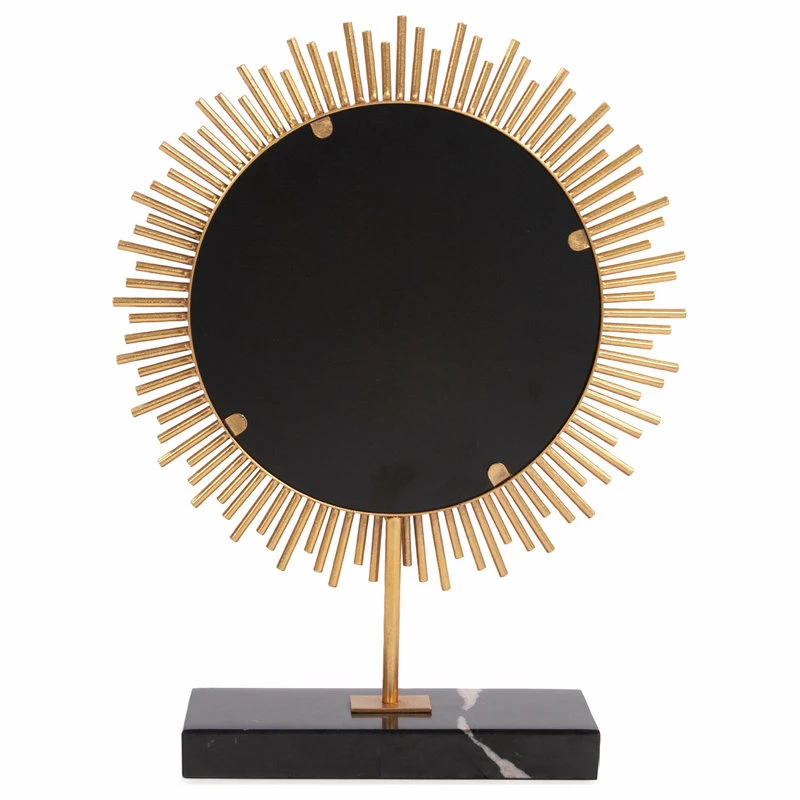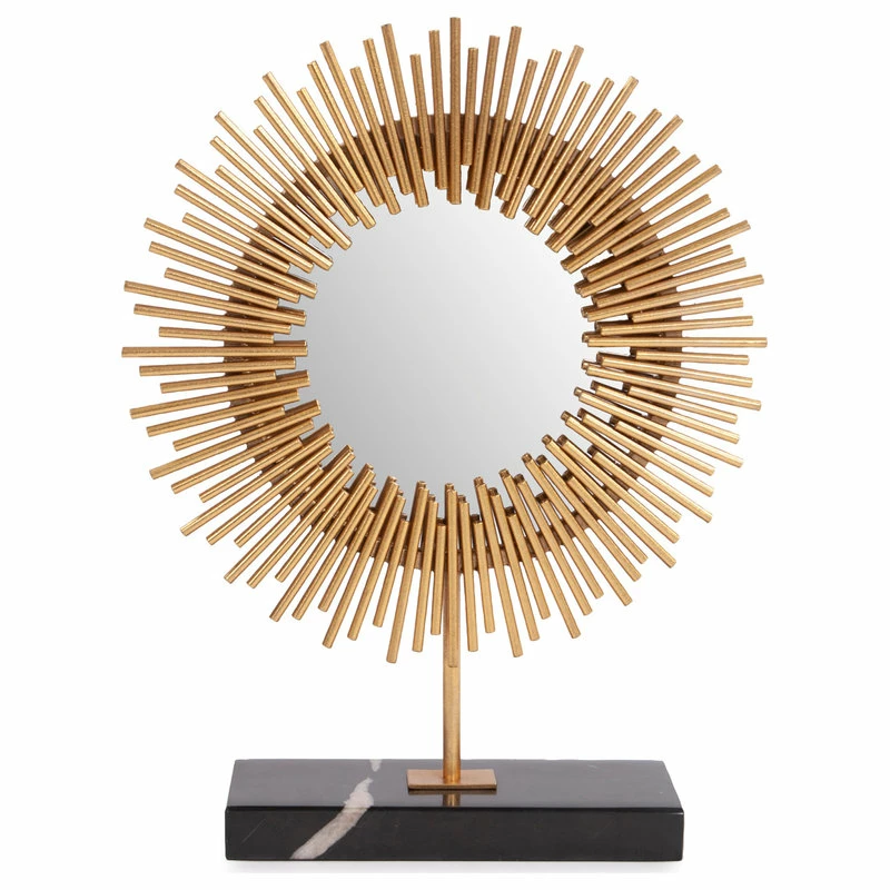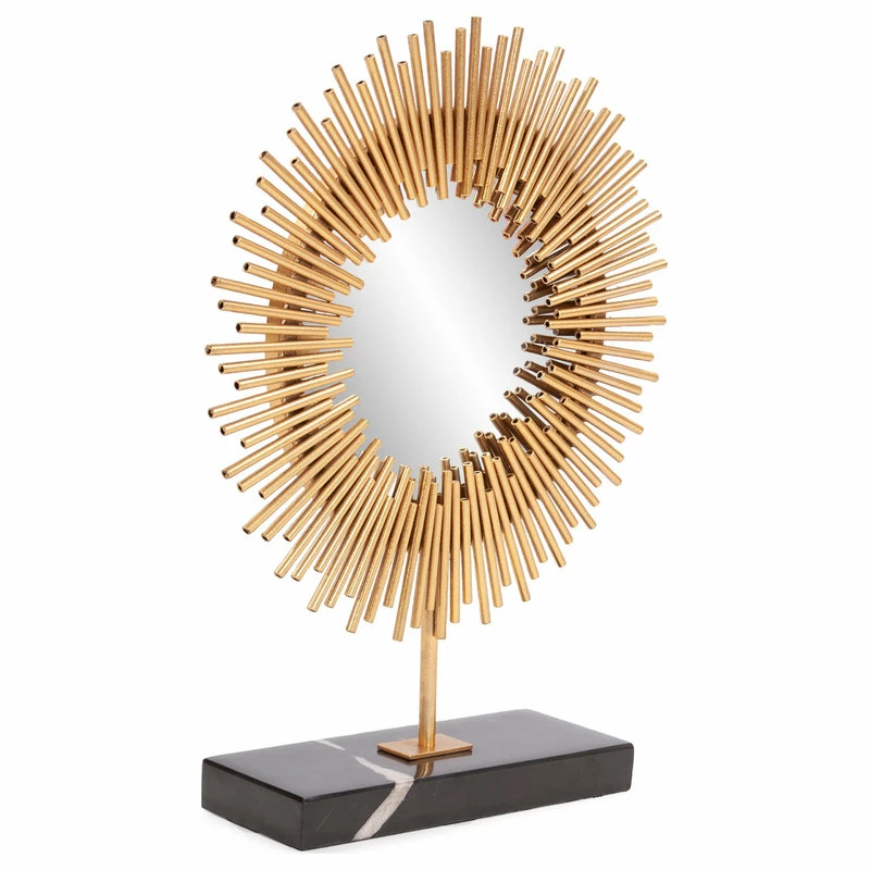 The Ra Table Top Mirror features a sunburst design of metal rods. The gold finish intensifies the radiating effect. The mirror is set on a black marble base.