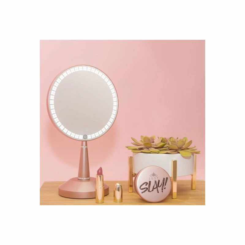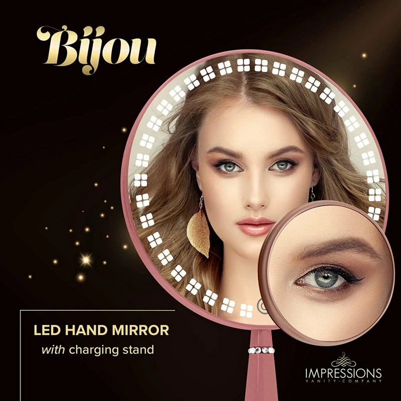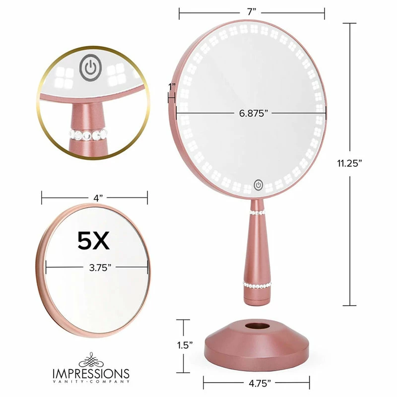 Impressions Vanity Bijou LED Hand Mirror with Standing Base and 5X Magnetic Magnifying Mirror, Rechargeable Round Shape Makeup Vanity Mirror with LED Lights
