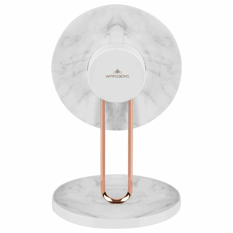 The Halo LED Makeup Mirror harmoniously combines antique marble and modern chic. Featuring our high clarity mirror equipped with a duotone LED light strip. To power up, tilt the mirror up. Spin the mirror counter-clockwise to switch between natural, warm, and cool lighting. Spin the mirror clockwise to adjust the brightness. This mirror is easily rechargeable with the included USB-C cable.