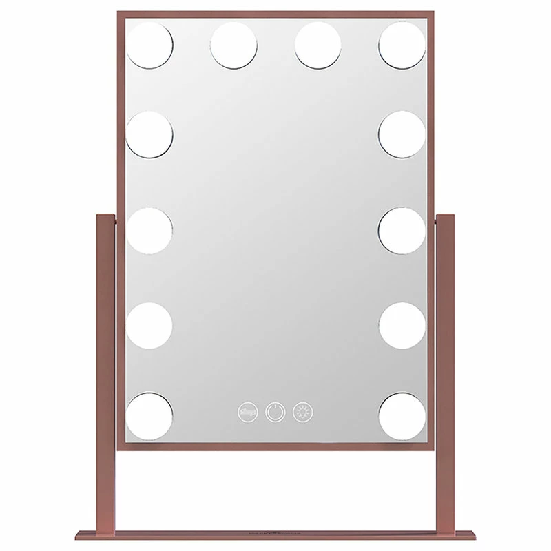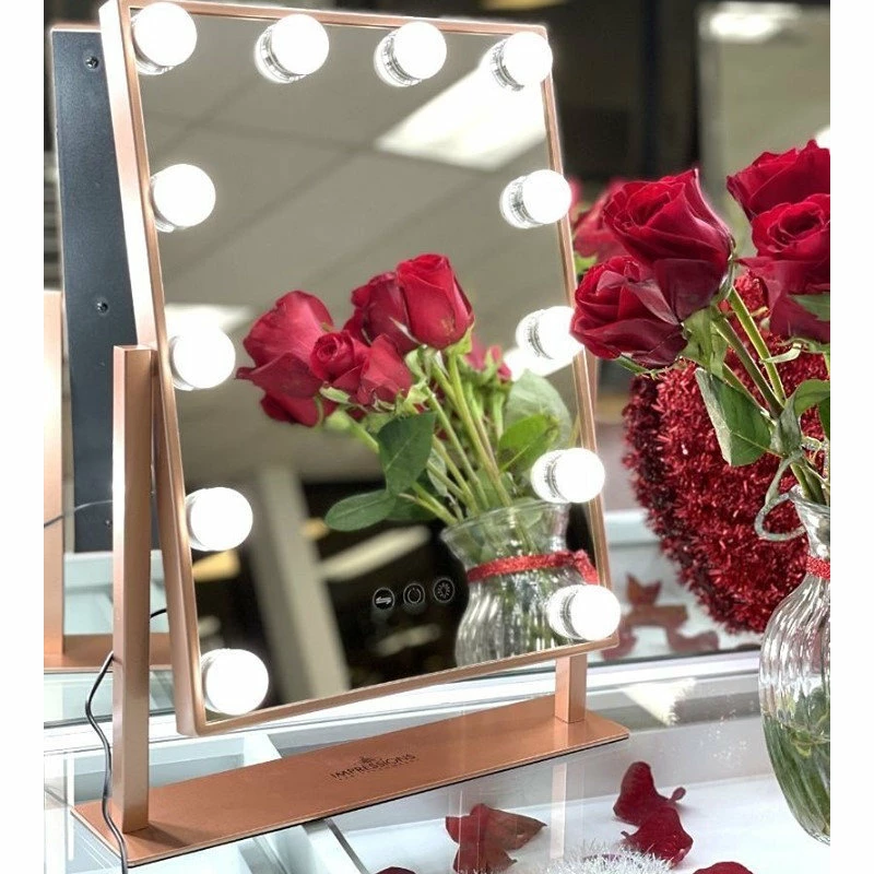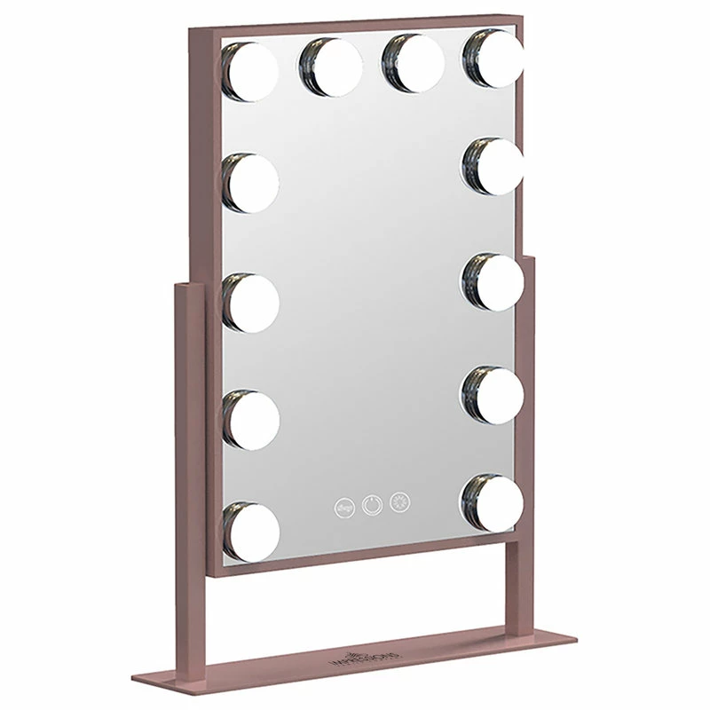 Fit our ultra-slim Hollywood Tri-Tone XL Makeup Mirror anywhere and complete your vanity set! Equipped with built-in long-lasting LED Lights around the mirror for even lighting. Tap the power button to power it on/off and hold to adjust the brightness to your perfect level. Tap the right button to switch between natural, warm, or cool lighting.