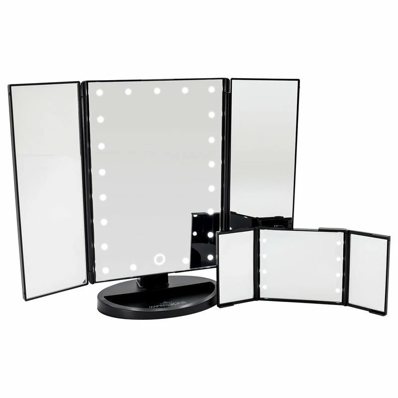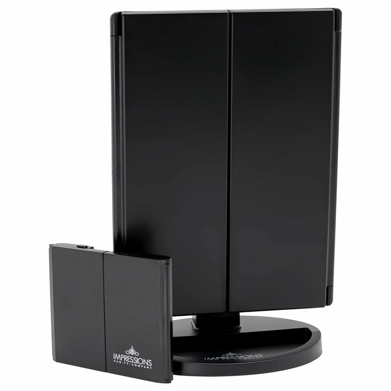 Touch & Go Trifold Makeup Vanity Mirror and ReveaLight Compact Trifold Mirror with LED Lights of Impressions Vanity is here to elevate your artistry to a whole new level. With three adjustable mirrors, you can position any which way to catch all the best light where you need it most!