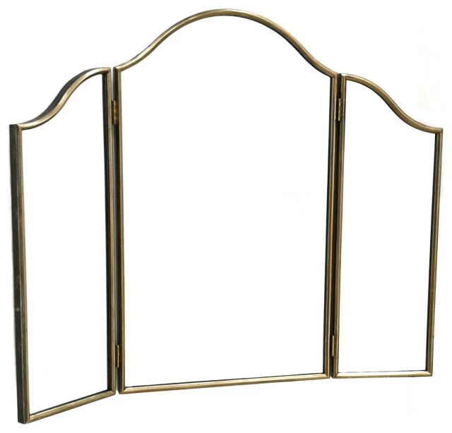 Beautify your living space with this beautiful Iron Tri-fold Mirror. Featuring three mirrors on a tri-fold frame, this elegant piece would make a great addition to any style of home Decor. The quality glass mirror and iron metal frame is sure to endure for years to come. Display the piece on your dresser to use as a vanity, or display the piece on a console table with accent decor to make a statement.
