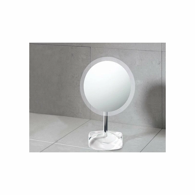 Decorative pedestal magnifying mirror with semi-transparent white thermoplastic base. Pedestal magnifying mirror. Base is made of thermoplastic resins. White colored base. From the Gedy Twist Collection.