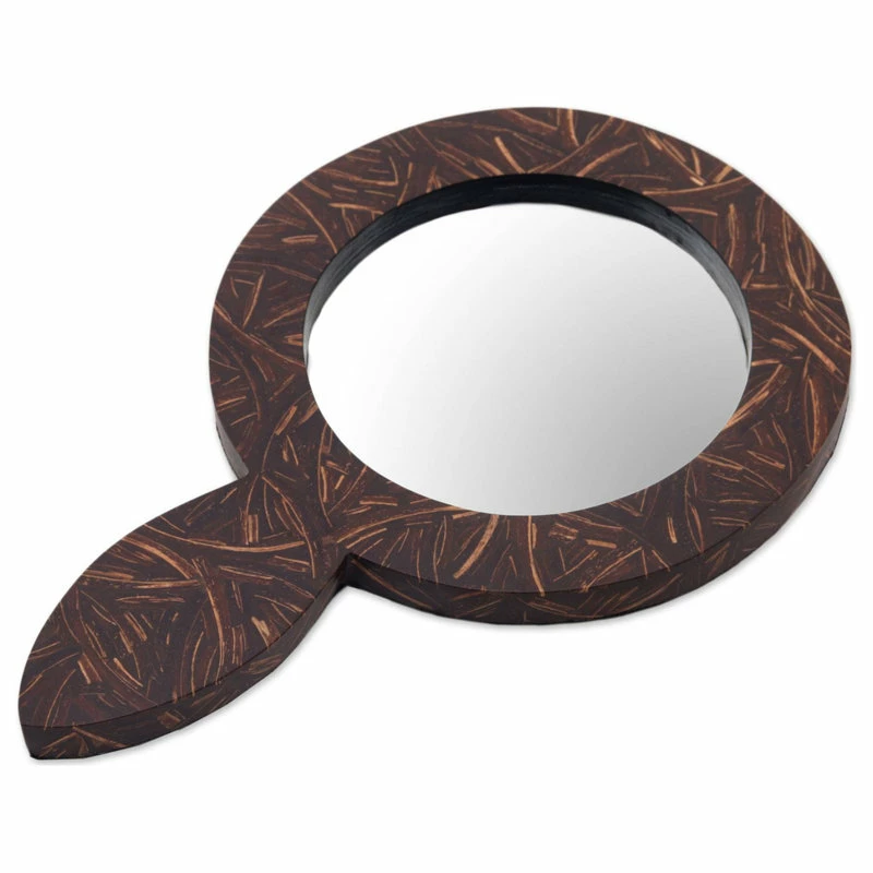 Indonesian artisan Dewi Hady employs the natural beauty of the coconut shell to create this unique hand mirror. Supported by an MDF base, the mirror features strips of coconut shell that create the design.