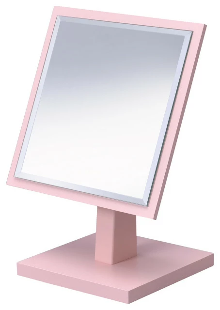 Svelte Pink Vanity Mirror perfectly angles for self reflection supported by sturdy square base. Framed in bevelled glass, mirror cuts rectangular shape fit for bathroom counters or vanities. Be able to rotate the mirror 360 degree angle! Ideal for shaving or makeup applications. Allows this bath accent to make a simple yet bold statement. Ideal for virtually any selling environment -especially jewelry stores or jewelry departments within a store. Mirror also works well near cosmetic counters, scarf and hat store counters and eye doctor’s offices or sun glasses stores.Features