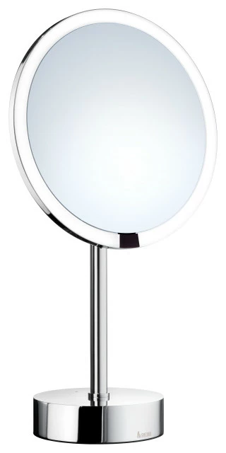 Freestanding lighted LED USB rechargeable Make up mirror/shaving mirror 7x’s magnification. Sensor activated LED lights with auto 15-minute shutoff. Battery and USB cable included. Mirror diameter 9″ – height 16″