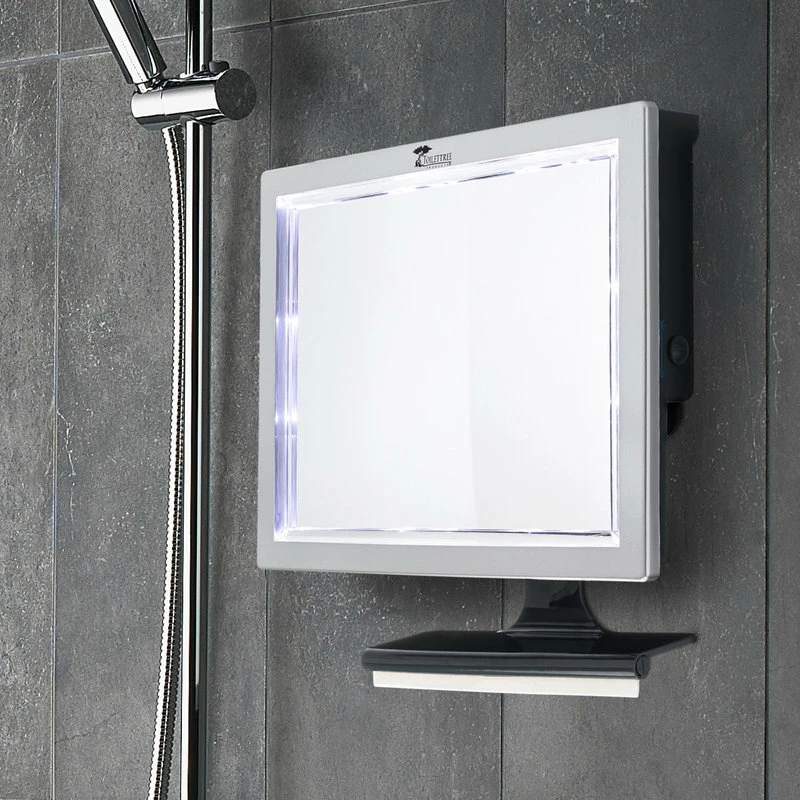 This lighted shower mirror is perfect for shaving, tweezing, removing makeup, applying facial masques, or using a facial cleansing brush. And it comes with a built-in shelf to store your razor, sponge or tweezers.